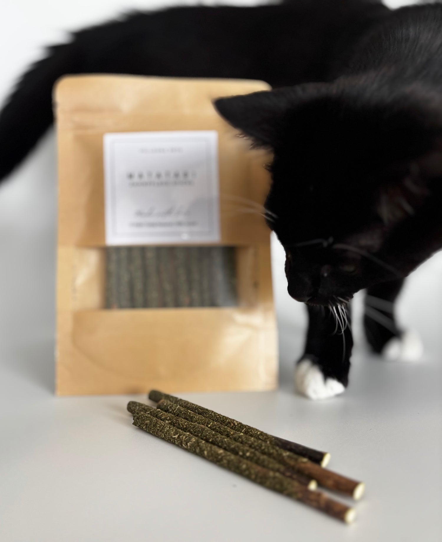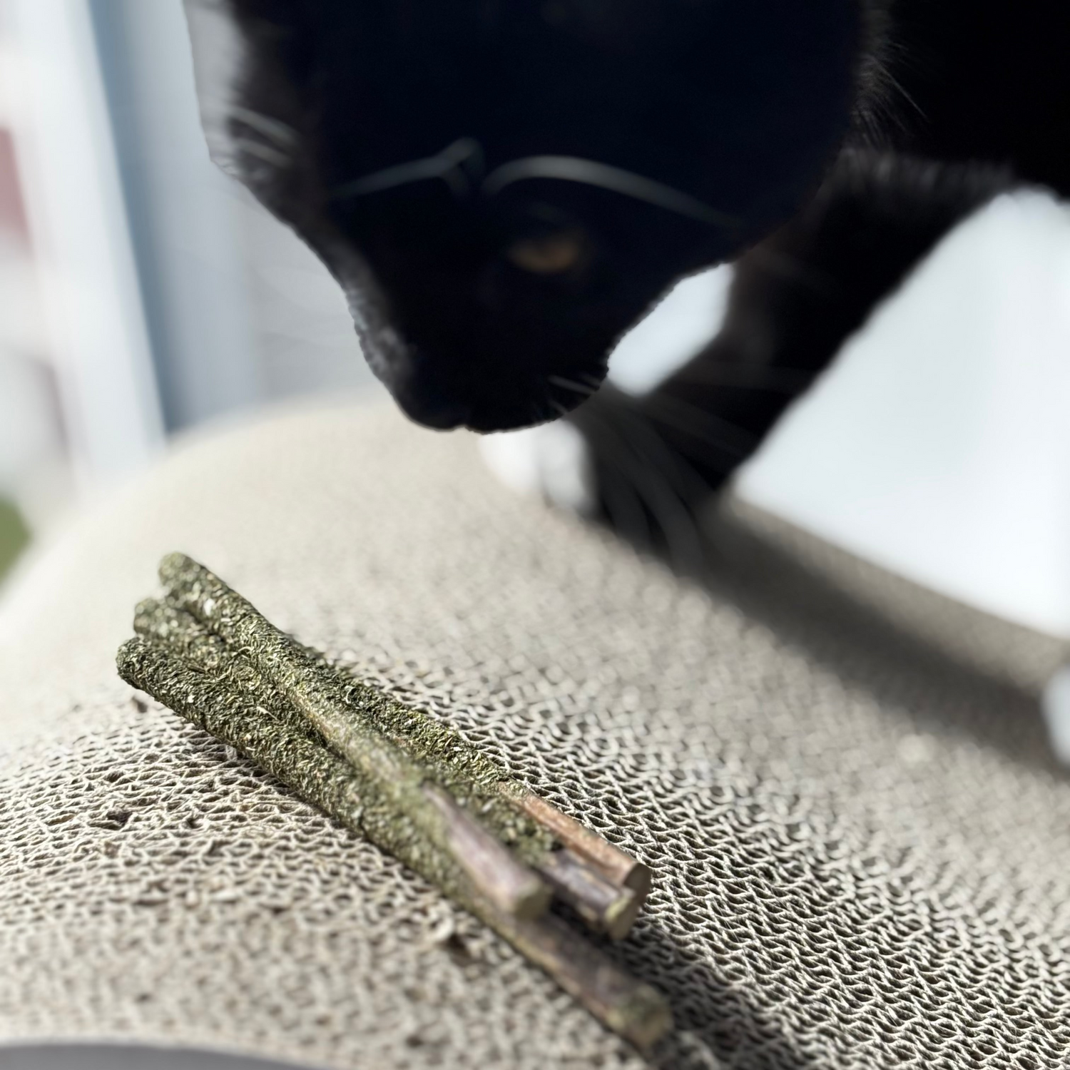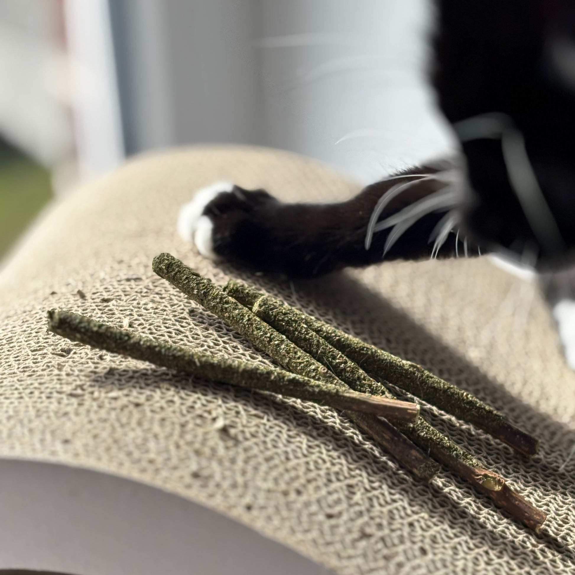 Einfach einen Stick aus dem Beutel nehmen und deiner Katze zum Erkunden geben. Die meisten Katzen beginnen direkt zu kauen, zu reiben oder sich spielerisch zu wälzen.