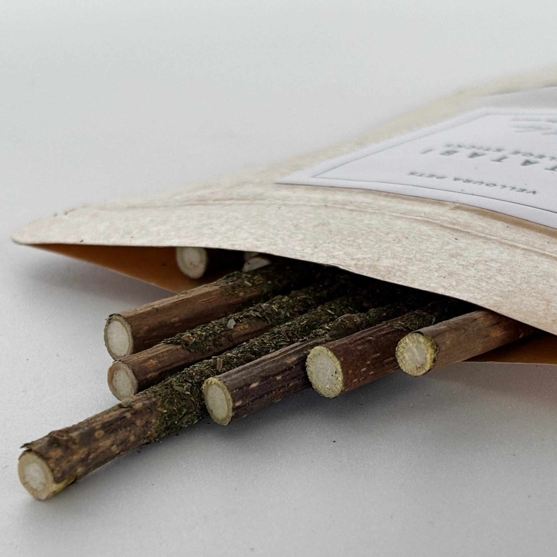 Feine Holzfasern splitten beim Knabbern auf und schrubben Zahnoberflächen sowie Zahnzwischenräume ganz ohne Paste oder Bürste.